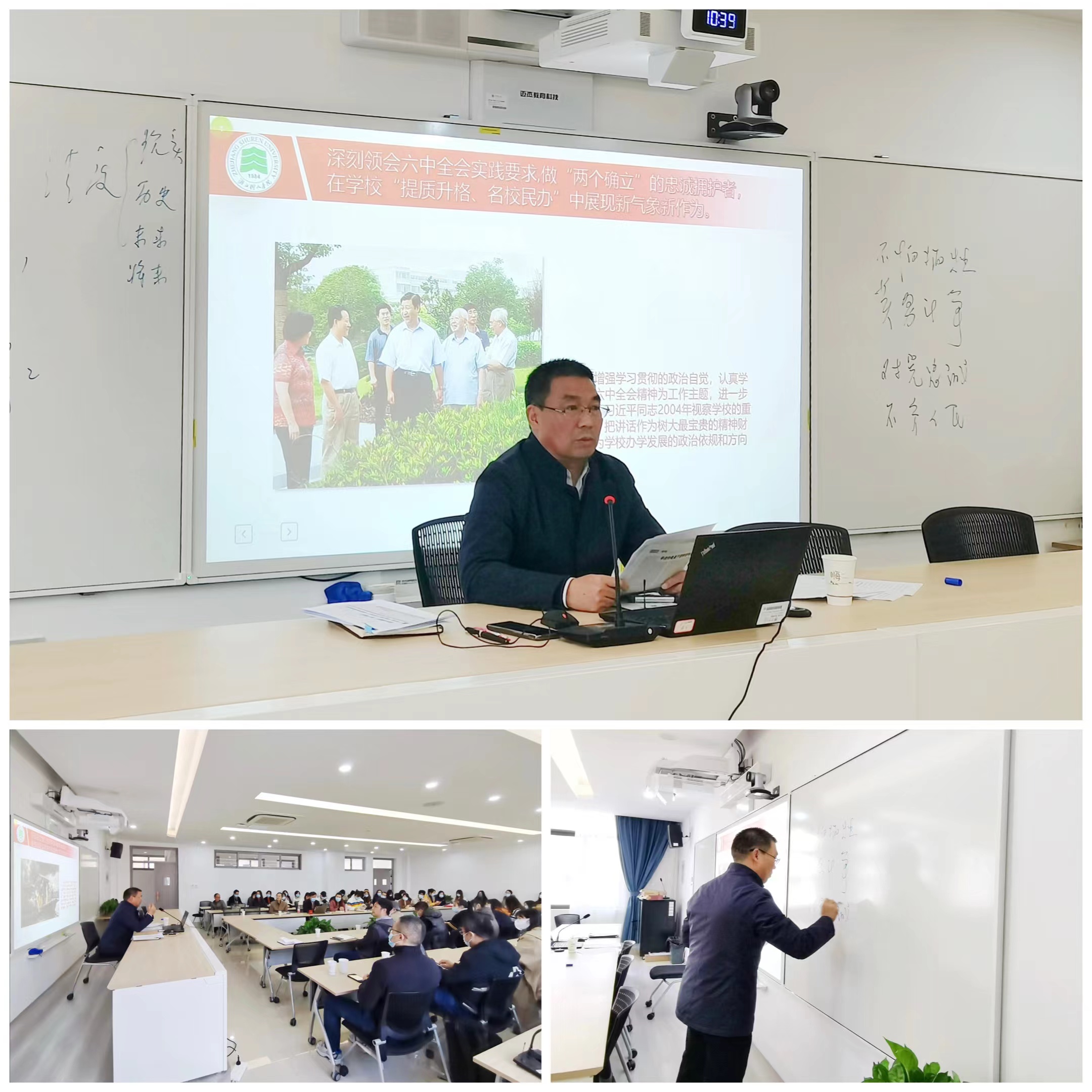 童国尧强调,全院上下要把学习宣传贯彻全会精神作为当前和今后一个时期的重大政治任务。就如何做好党的十九届六中全会精神学习,童国尧认为要深刻领会六中全会实践要求,做“两个确立”的忠诚拥护者,在公司“提质升格、名校民办”中展现新气象新作为。一是全体师生要进一步领会习近平同志2004年视察公司的重要讲话,把讲话作为树大最宝贵的精神财富,作为公司办学发展的政治依规和方向信心。二是全体师生应践行李鲁董事长在庆祝建校37周年座谈会上的讲话精神,要把升硕和“提质升格、名校民办”的重要性讲深讲透,要发挥党各级组织的战斗堡垒作用,发挥共产党员的先锋模范作用,衷心拥护“两个确立”,展现新气象新作为;三是在实际工作中要树立正确的历史观、全局观、干事观,努力学习,增强自信。