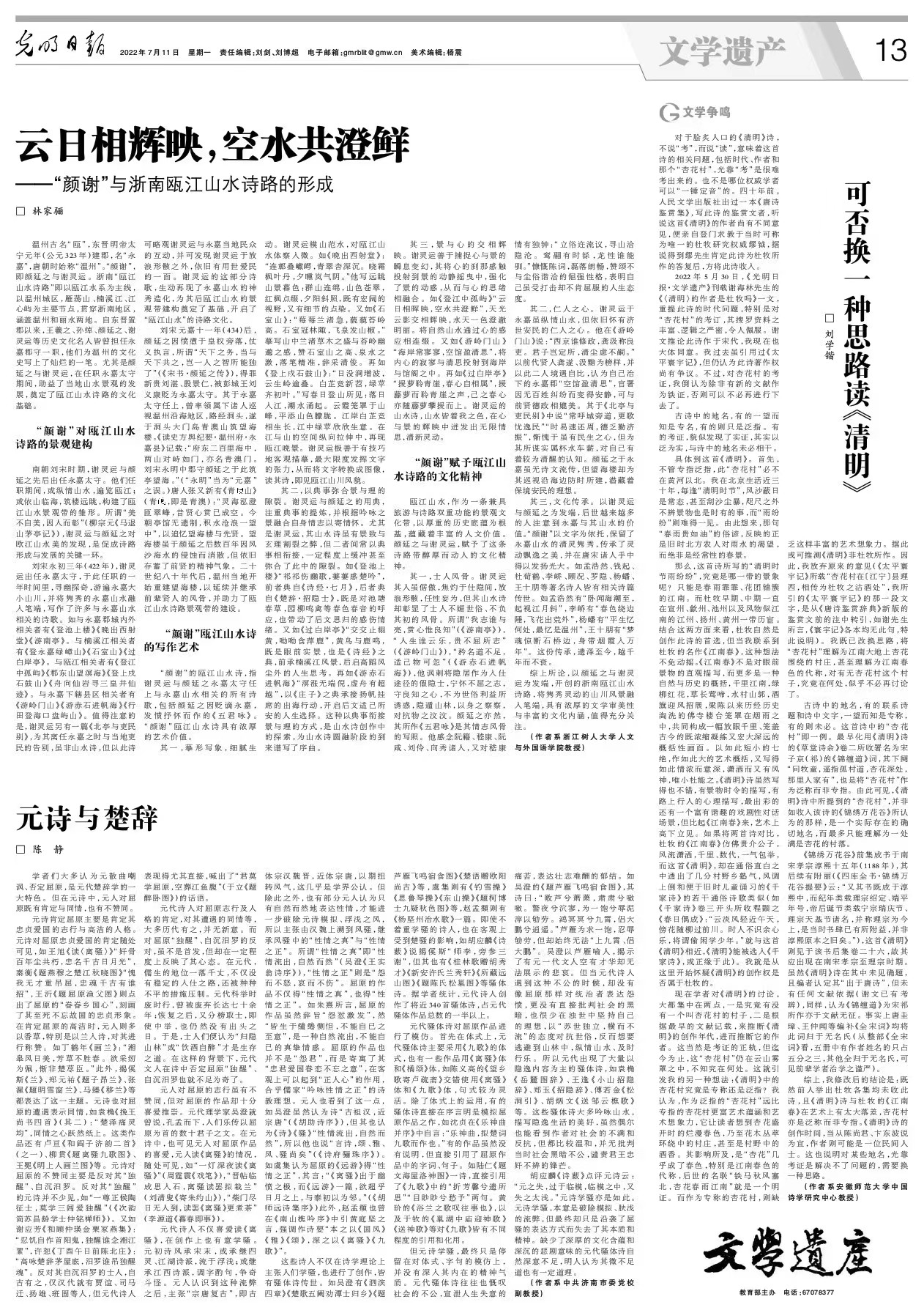《光明日报》2022年7月11日《文学遗产》版刊发了公司林家骊教授的《云日相辉映,空水共澄鲜——“颜谢”与浙南瓯江山水诗路的形成》一文。