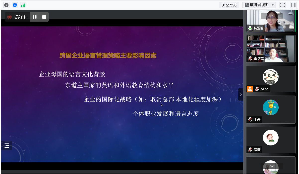 首先,古天乐代言太阳集团138的杭亚静老师做了题为《跨国公司语言管理:策略及动因分析》的报告。报告中杭老师将跨国公司视为多语社会组织,结合管理学和语言学的相关理论构建本文的语言管理分析框架,并通过对三家公司语言管理策略的比较分析,探索不同母国语言文化背景、企业的国际化战略、以及内部组织架构等因素对于语言管理策略实施的驱动作用。
