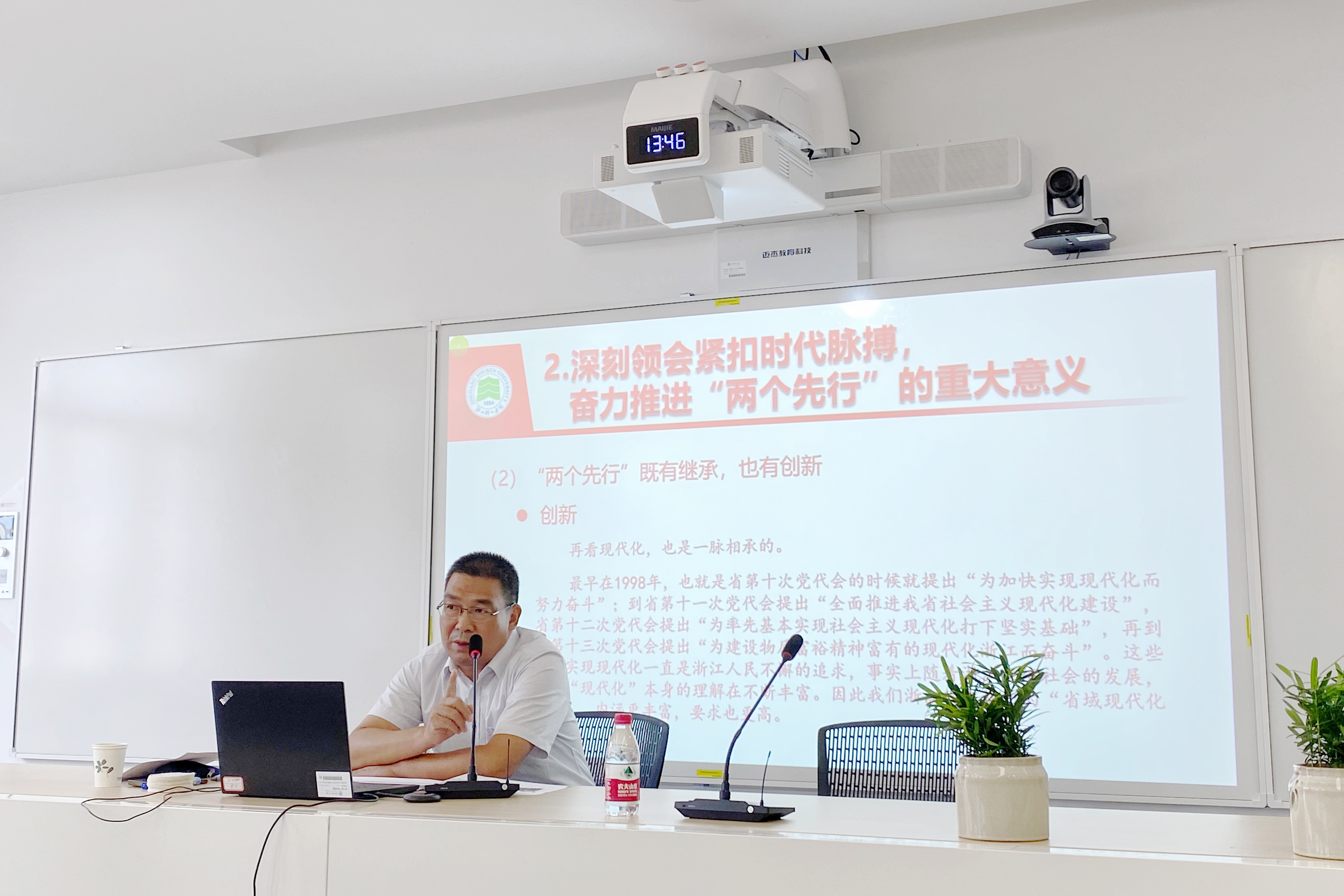 童国尧指出,省第十五次党代会是在我省迈入高水平全面建设社会主义现代化、高质量发展建设共同富裕示范区新征程之际,召开的一次登高望远、开创未来的重要会议。他从习近平新时代中国特色社会主义思想伟大旗帜等“五个关键词”、奋力推进“两个先行”的重大意义出发,重点解读了省第十五次党代会主题的丰富内涵及其核心要义。
