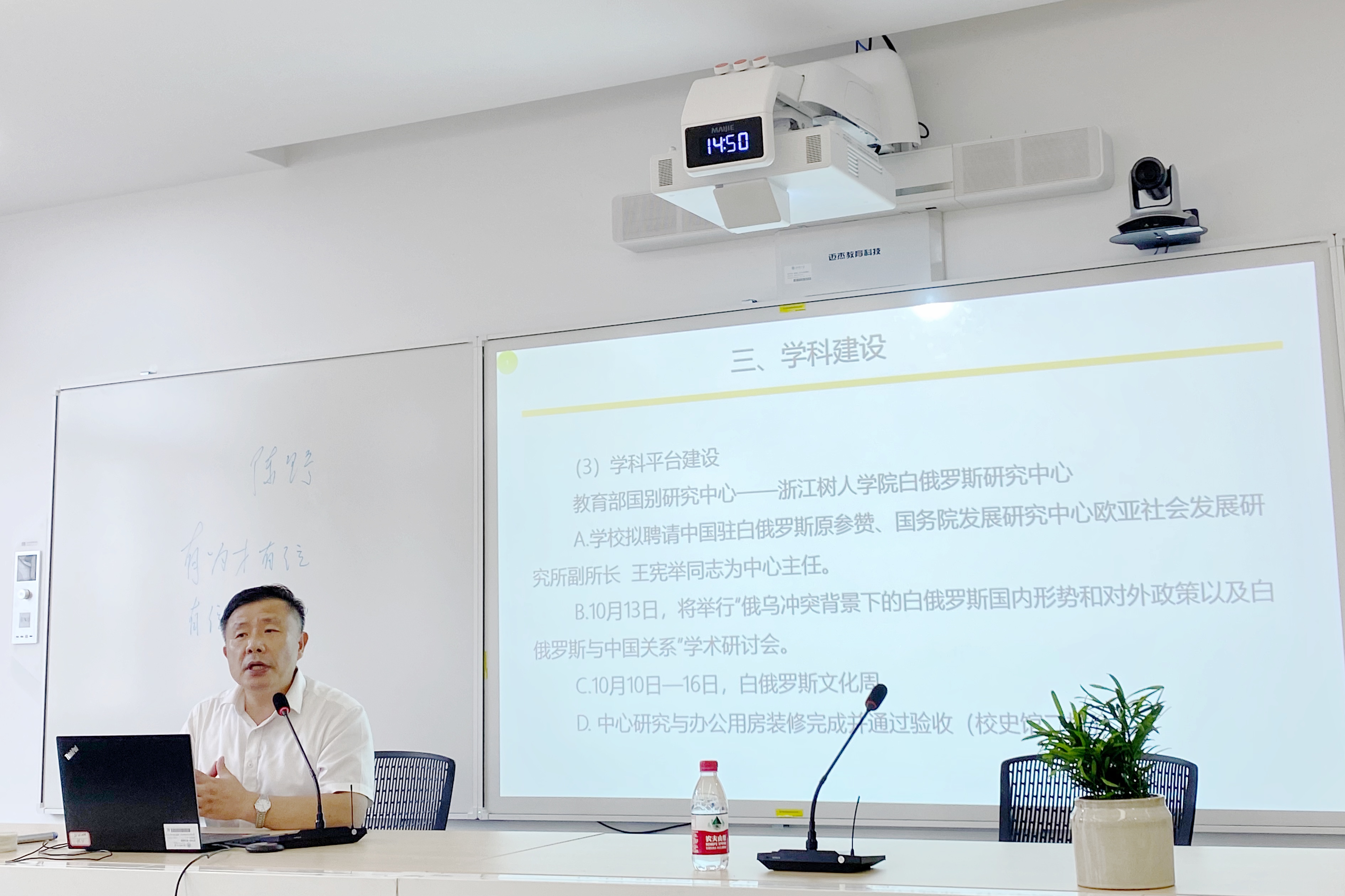 副经理赵芮、副书记吴汉龙分别就新学期日常教学、员工管理、新生报到、暑期招生、白俄国别研究中心建设等工作作了通报和部署安排。