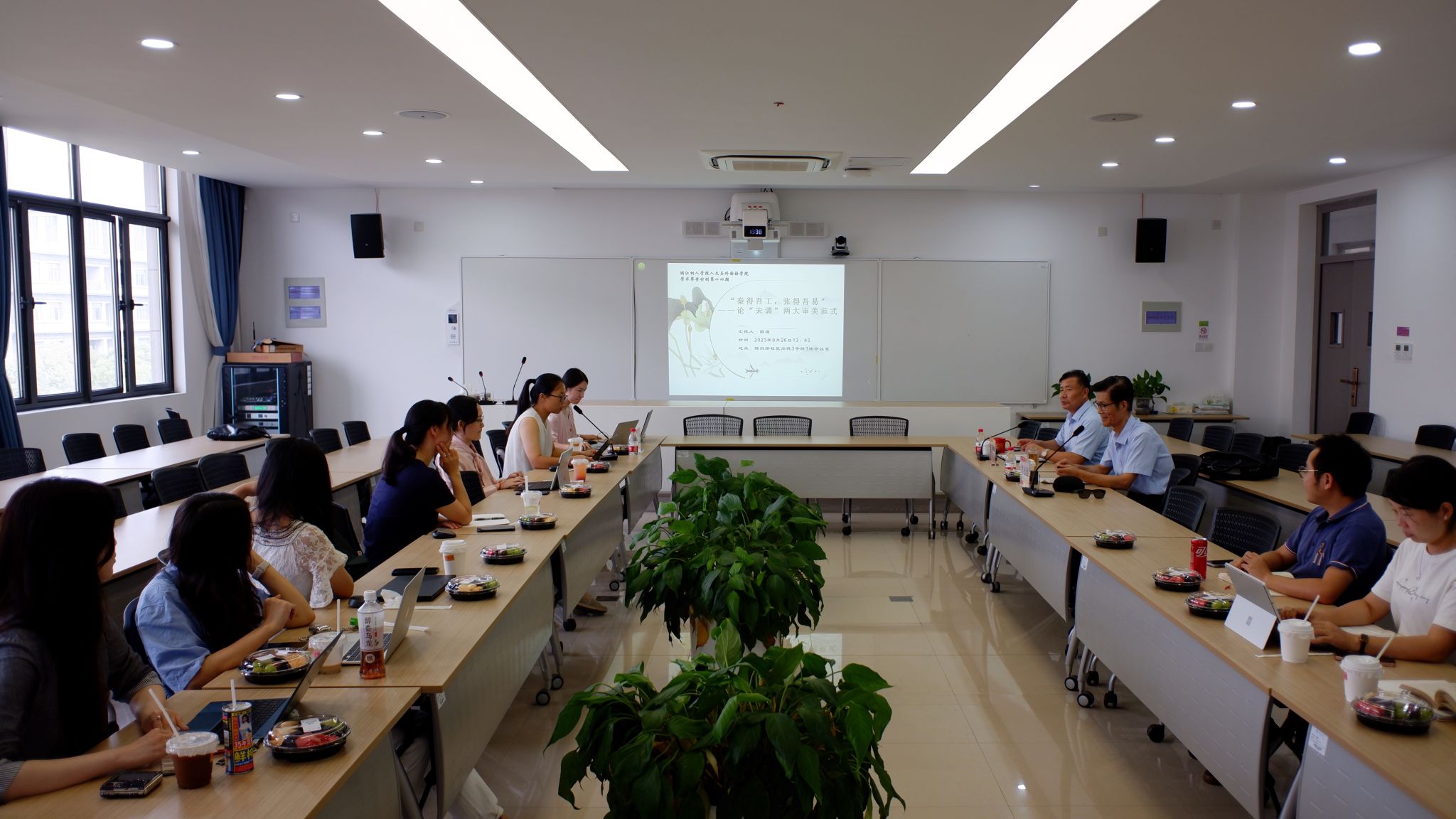 秋日暖阳,山林清风,杨汛桥人外会议室里台席无虚。令人欣怀的是,薛老师在汇报中提及宋代元祐时期,“苏门”文士集会、谈诗论道的盛况,于今日青年教师学术交流正好遥相呼应,或许这才是宋贤风流沾溉万世的遗韵吧。