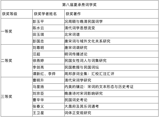 “夏承焘词学奖”是国内词学研究领域最高专业奖项。该奖项以已故词学大家夏承焘先生的名字命名,于1990年设立,每三至五年评选一次,旨在奖掖优秀词学研究者,促进词学研究的发展。评选工作由中国韵文学会、夏承焘词学奖评奖委员会秘书处具体实施。