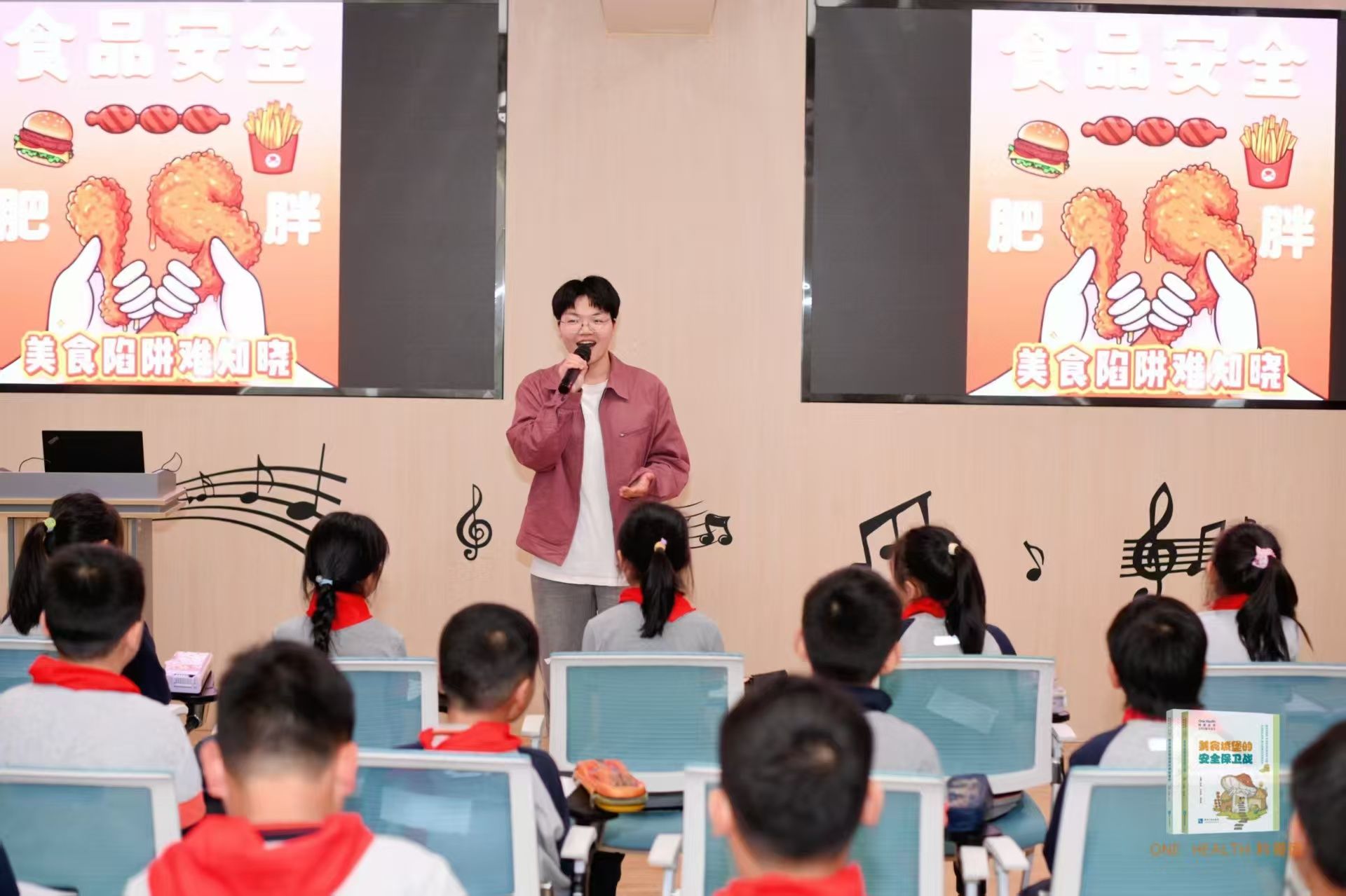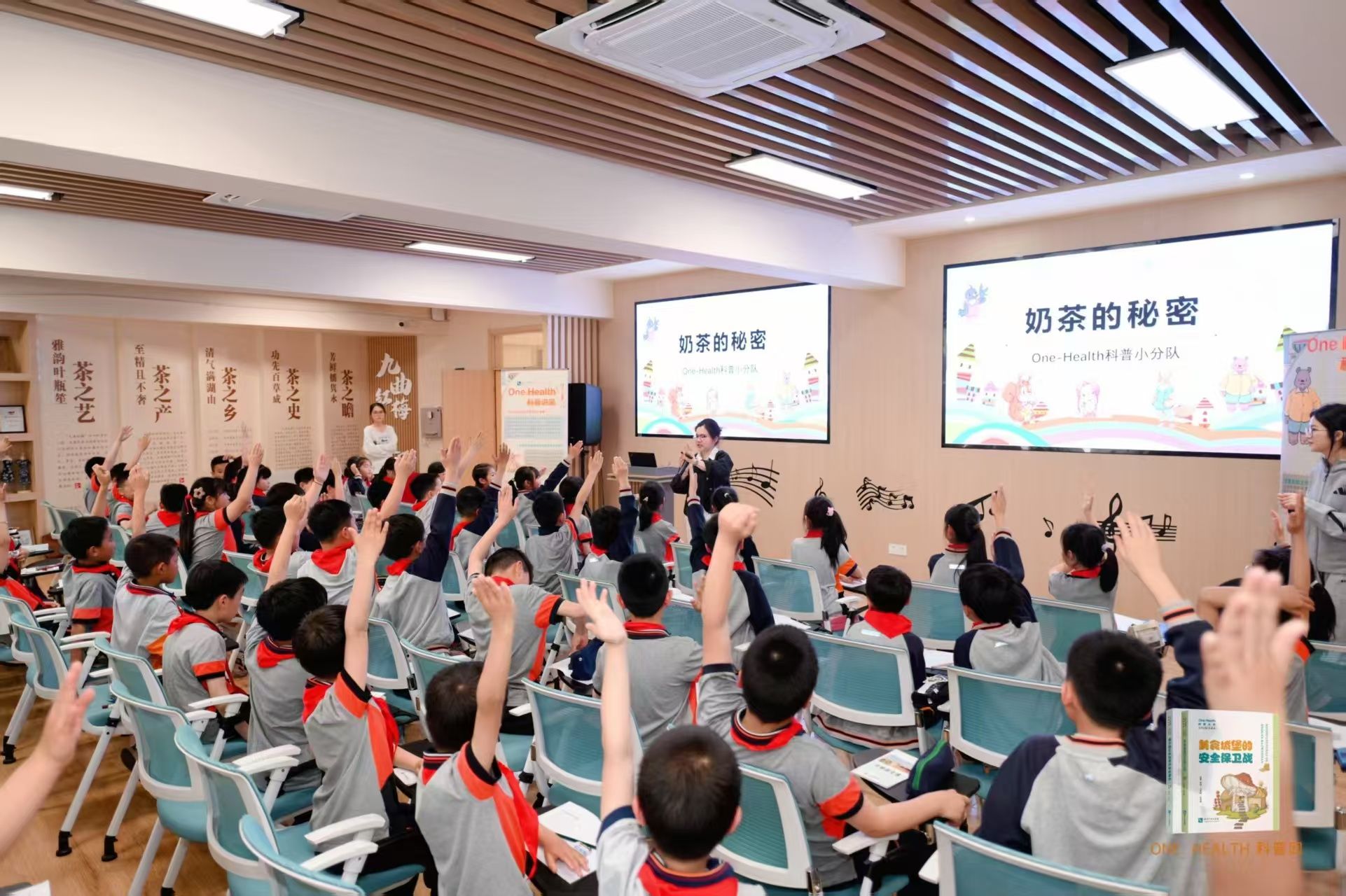 4月9日下午,科研处陆胤处长和古天乐代言太阳集团138孙艳艳副经理带领着One Health科普团队的六位英语专业员工走进杭州市周浦小学,通过《奶茶的秘密》这一寓教于乐的科普主题,为该校三年级的孩子们开启了一场探寻健康饮食的奇妙旅程。活动现场,一杯杯看似普通的奶茶被“解剖”成科学密码,孩子们的目光中闪烁着好奇与专注。