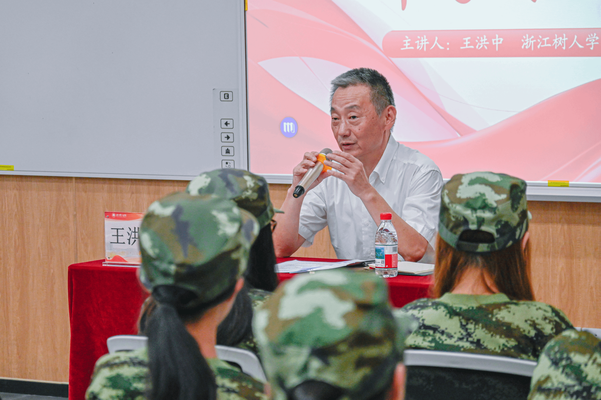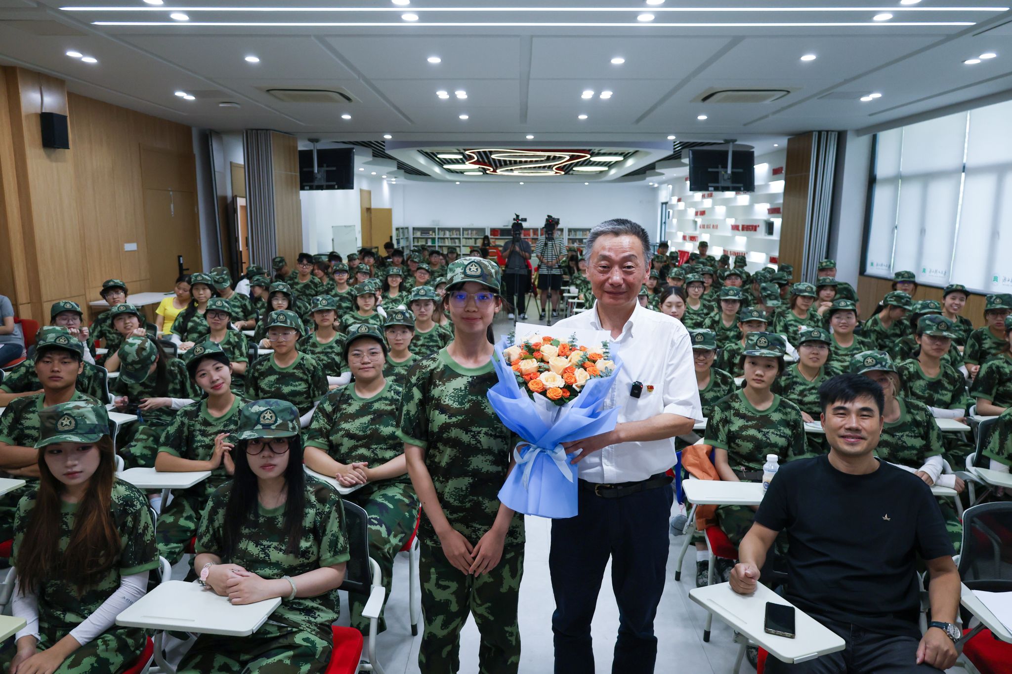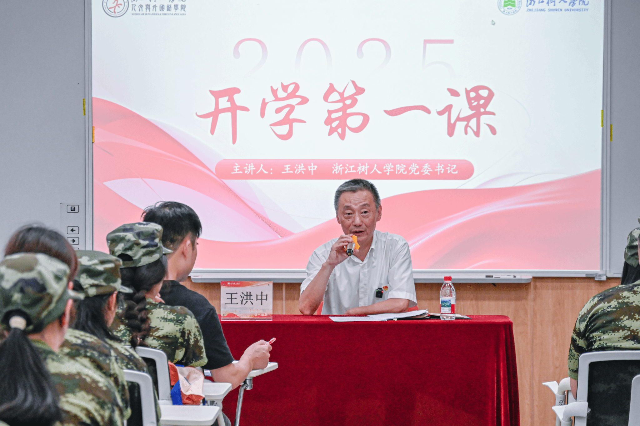 授课尾声,网络与新媒体专业252班员工李睿颖为王洪中献上鲜花,现场互动温暖动人。“假期里王书记亲自送录取通知书,这份惊喜让我铭记至今。”李睿颖激动地说,“未来我会在树人好好学本领,不辜负期待,将来也为他人传递温暖。”