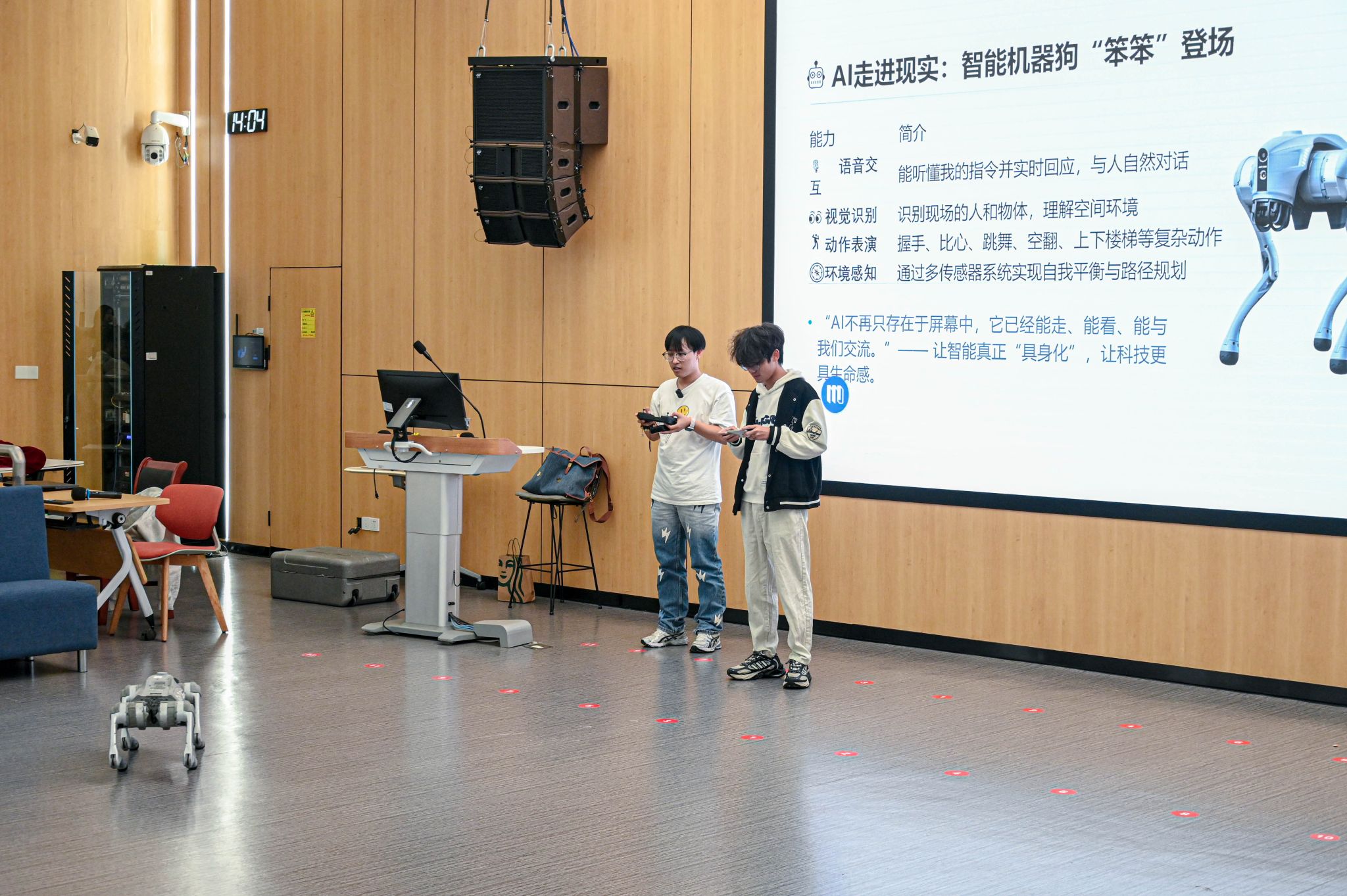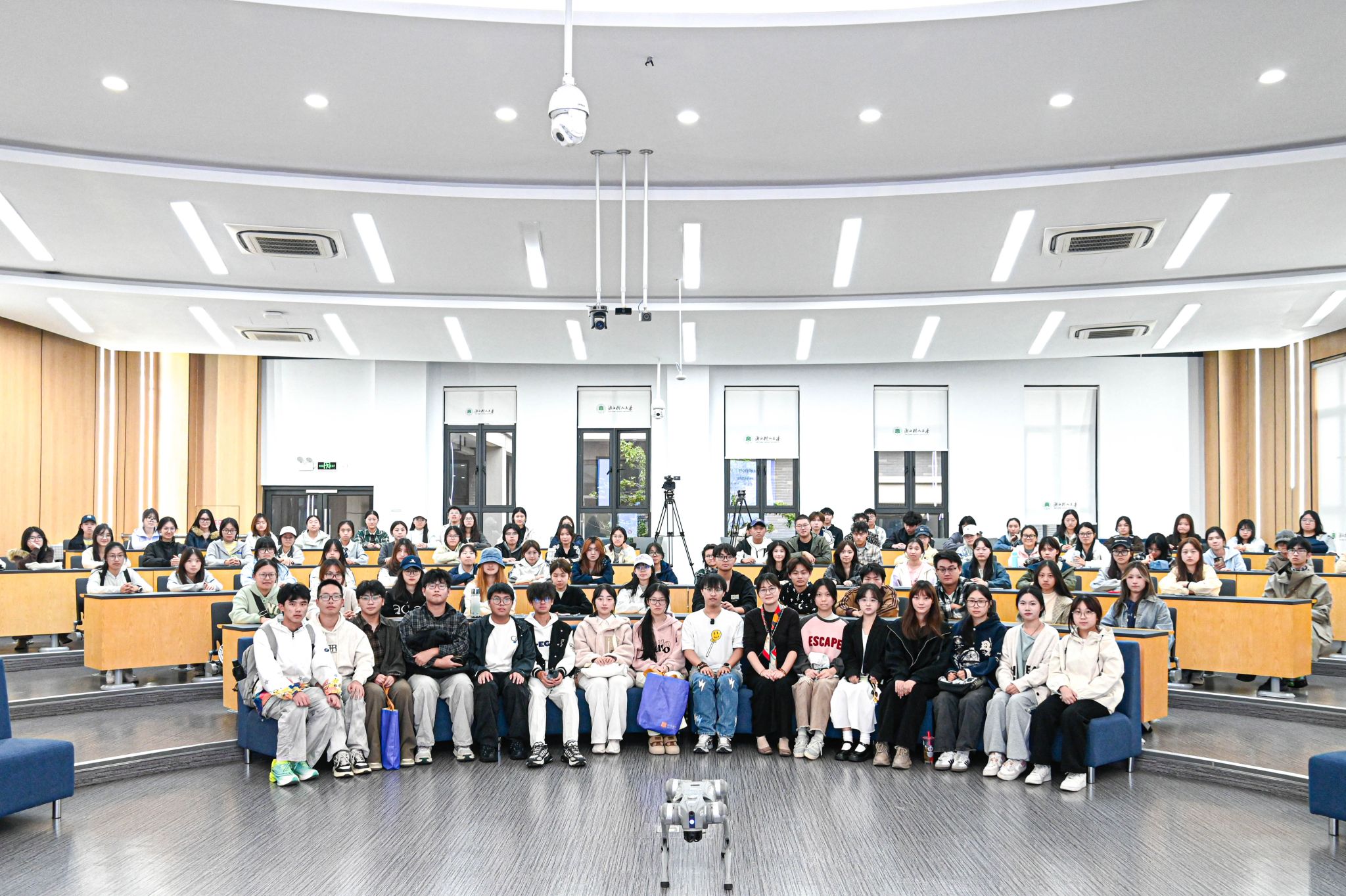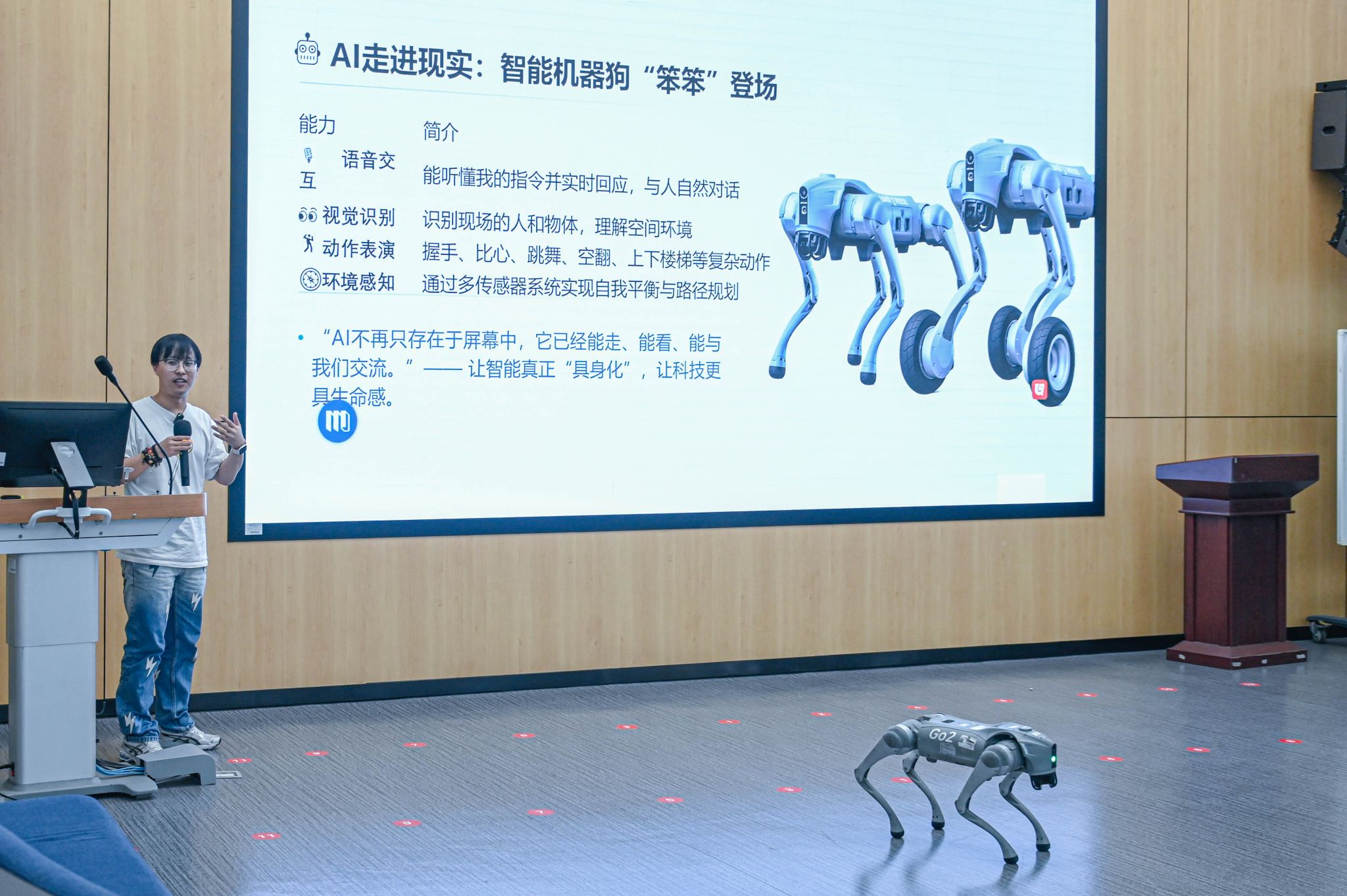 讲座之后,主持人隆重邀请出宇树科技的明星产品——智能机器人“笨笨”。这只搭载了先进AI算法的机器狗,瞬间成为了全场的焦点。它不再是一个抽象的概念,而是以一个鲜活、灵动的实体,走进师生们中间。
