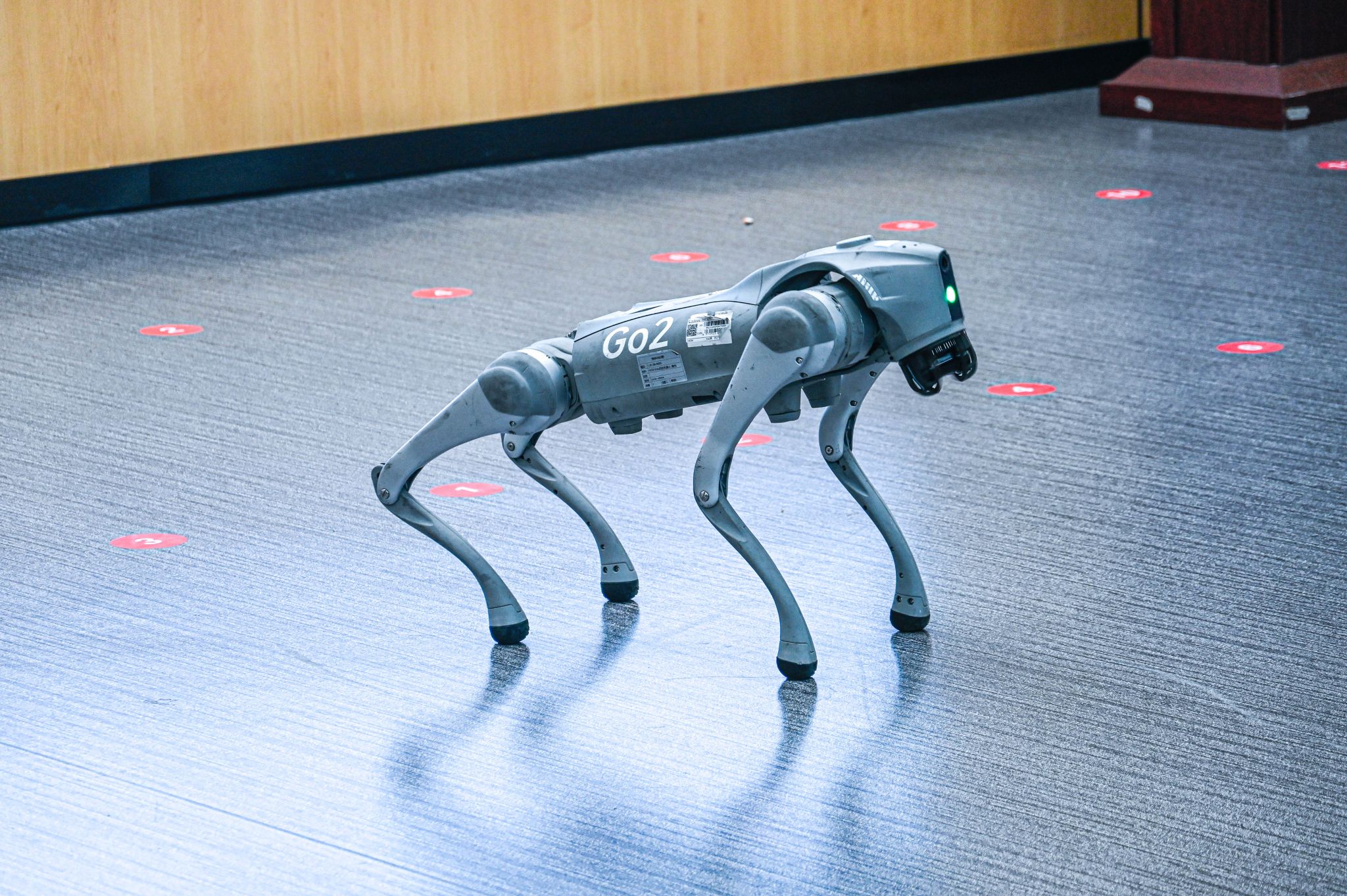 “笨笨”的展示精彩纷呈。它先是与员工们进行互动,对挥手、坐下等指令做出灵敏反应,其拟人化的动作和“眼神”交流,让现场充满了欢声笑语。紧接着,它展示了令人瞠目结舌的运动能力:一个干净利落的“原地后空翻”,展现了其强大的爆发力与精密的控制算法;一个充满温情的“比心”动作,瞬间拉近了人与机器的情感距离;最令人叹为观止的是它的“上楼梯”演示,它通过前肢的相机和雷达实时感知环境,精准判断台阶高度,协调四肢,稳步而自信地完成攀登,充分体现了其在复杂地形下的自主决策与环境适应能力。
